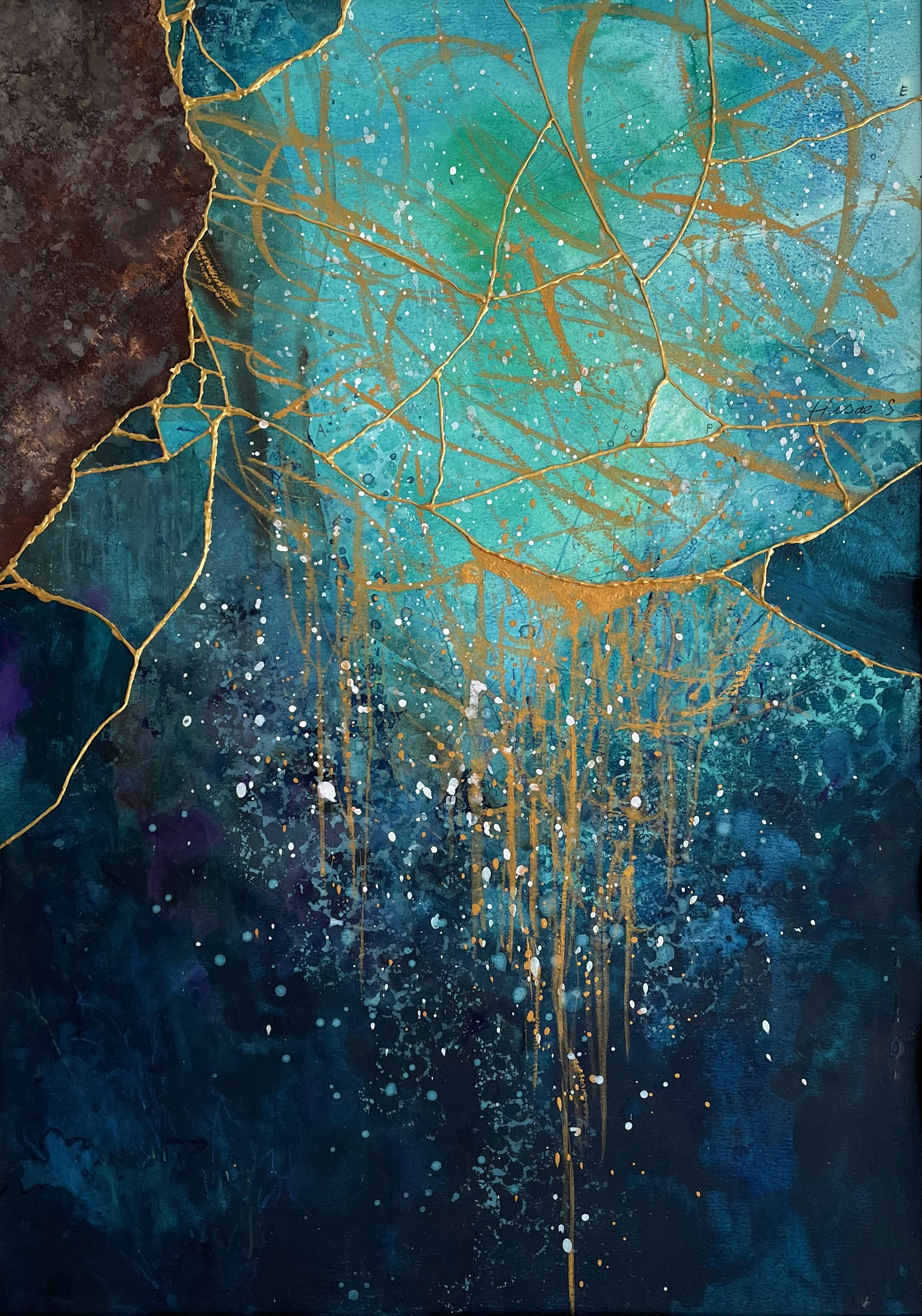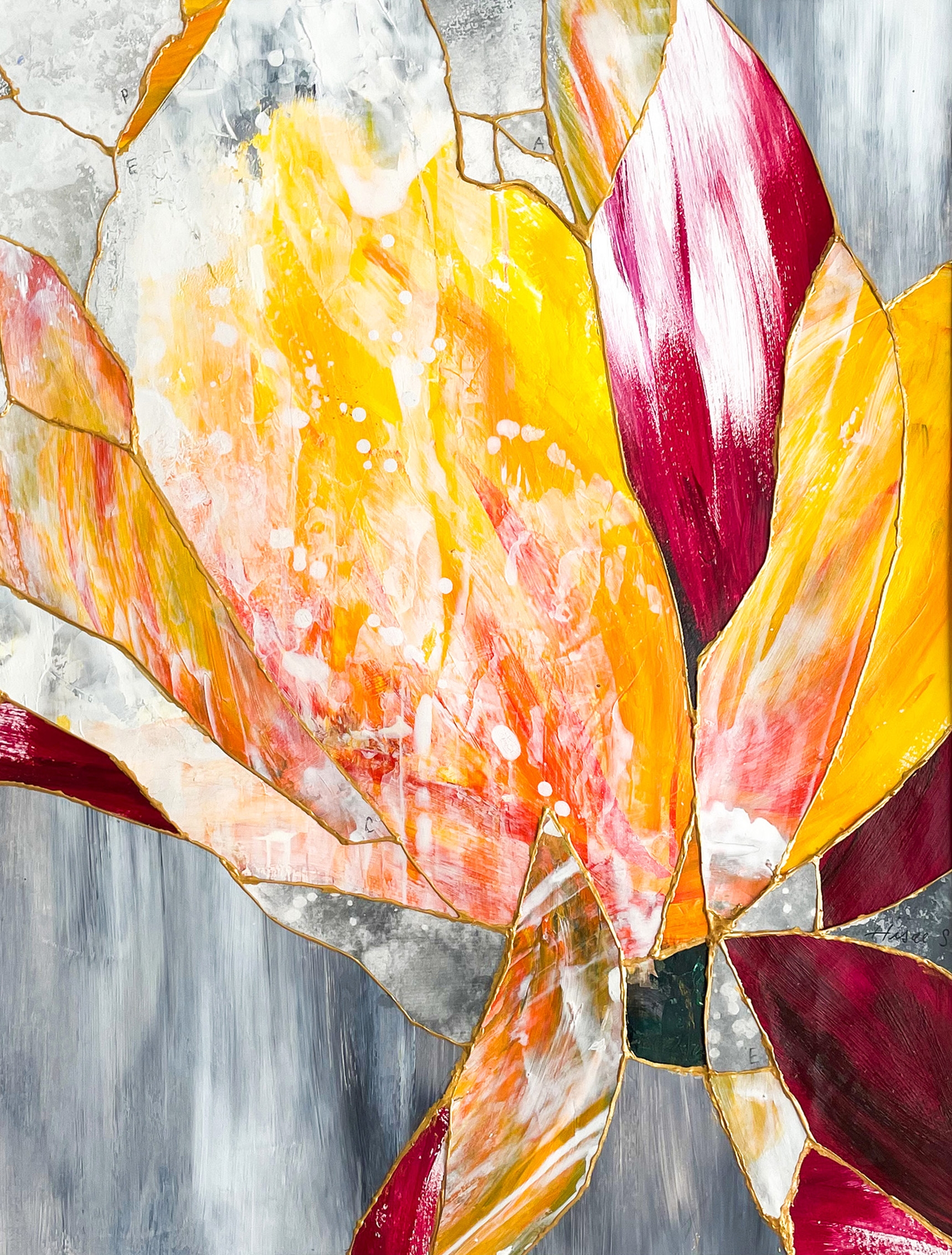 海外での展示にも挑戦したいと思っていたので、海外市場へも進出していきました。ただ、生花を用いるため、展示するにも現地で調達する必要があり、それが課題でしたね。そこで、自分の作品をコラージュしてみたら、とても面白く感じました。そうしてコラージュの魅力を感じていたある日、SNSで金継ぎを目にしました。そこで、次は金継ぎからインスピレーションを受けて、紙同士の間に金の絵の具を塗る作品を制作してみました。これを機に、金継ぎをモチーフとした作品制作がスタートしました。映画や風景など何かを見ること、頭を空っぽにしてクリアな状態にすることで、作品のヒントを得ています。