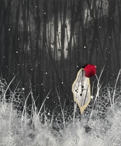映画や風景など何かを見ること、頭を空っぽにしてクリアな状態にすることで、作品のヒントを得ていると話す。墨と花を融合させた作品から、次に題材とされたのは金継ぎをモチーフとした作品。新たなるテーマに着目し、さらにご活躍される佐々木さんに、金継ぎをイメージした作品に対する想いを語っていただいた。