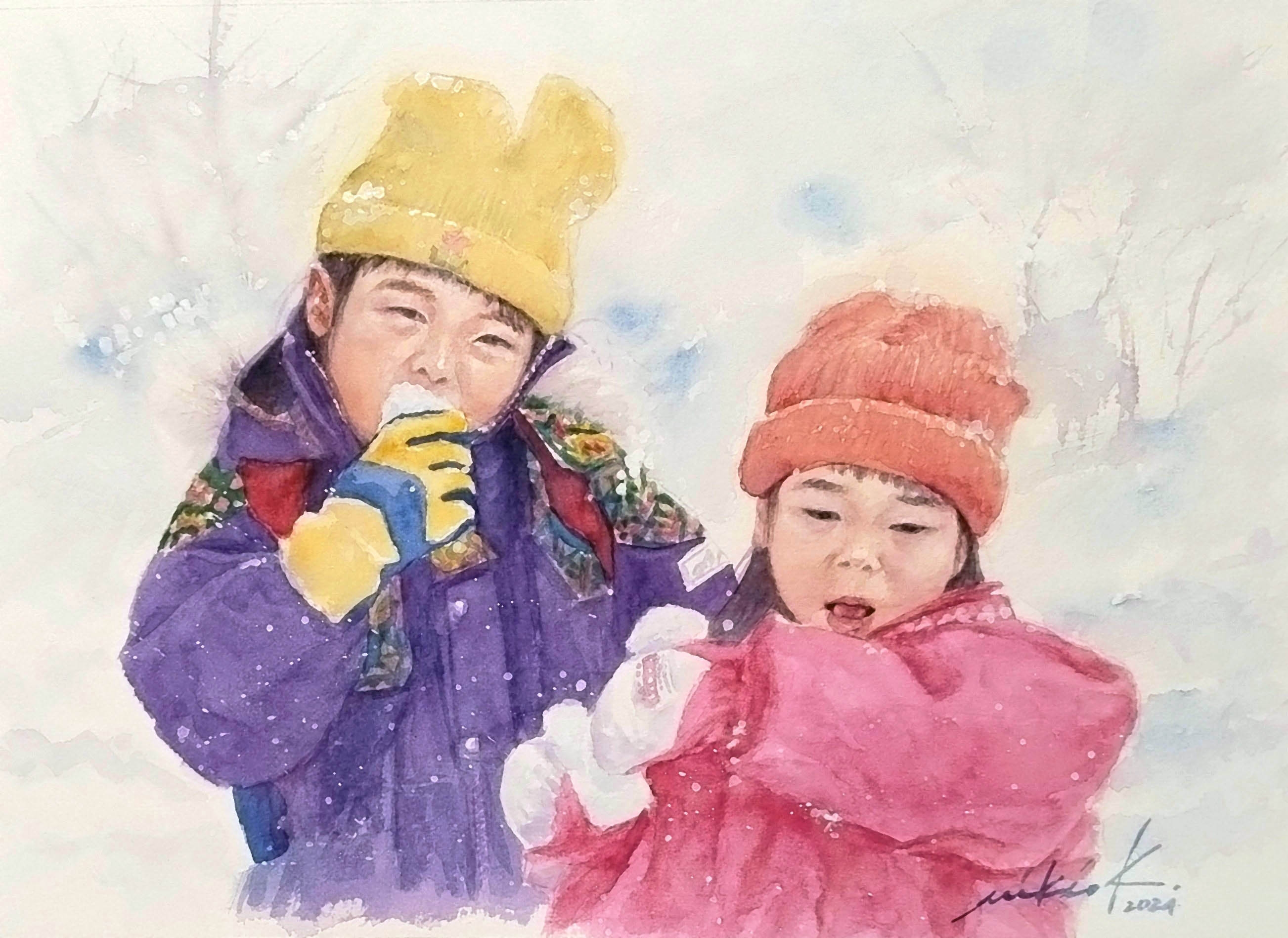 近所の寺院で撮った写真や、スキー場で雪を食べている写真、入園式に滑り台で遊んでいる写真、ニジマス掴み取りしている写真など本当にいろんな写真があって、当時が蘇るようでした。娘たちは今は結婚して家を出ていることもあって、しみじみと昔を振り返りながら、そういった写真をもとに絵を仕上げました。我ながら良い出来栄えだと思っています。