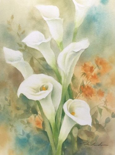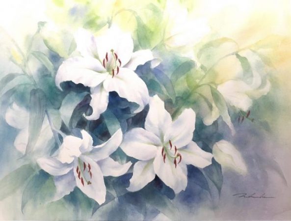 絵の具と水が画面で生み出す偶然、ぼかし表現など、水彩画の魅力を生かすタッチで