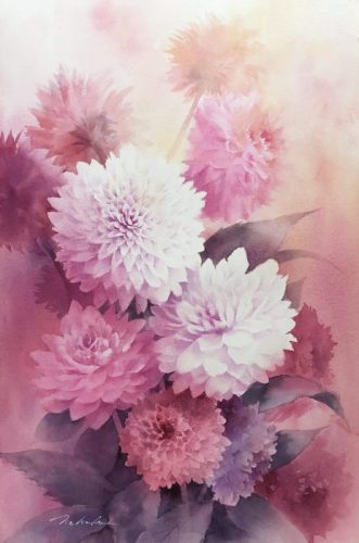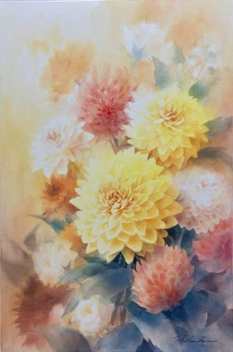 こんな素敵な画材があったのだというのがひとつの発見でした。透明水彩のもつ透明感、紙の白を生かしながら上に乗せた色、そこにまた色を乗せて、両方生きてくるという絵具の持つ魅力に憑りつかれました。透明水彩は水で動きます。描くというより色を置く。色を置くと水に乗って広がったり混ざったり。完成したものも好きですが、描いているときの紙の上で遊ぶ感じもすごく魅力的です。花とその周りの空気感を描きたいときに透明水彩の良さが生きてきます。