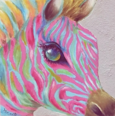飲食店勤務の関係からオーストラリア発祥のカフェ看板などに使われるチョークアートを学び、2020年より作家活動をはじめました。 ペットの似顔絵などを描くうちに動物の表情に魅せられ、カラフルにPOPに動物画を中心に描いています。 みて元気になれるような絵を、オイルパステルという画材を用いて、木製パネルに主に指を使って色をを混ぜてかいています。
