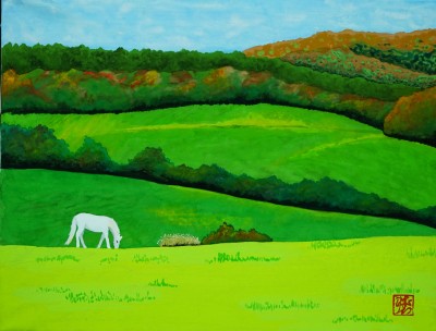風景画にはアクセント的にサギや蝶が舞います。