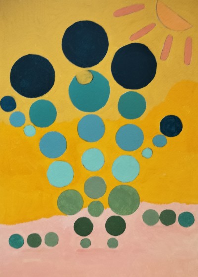 「“卵ヒーロー”はオリジナルキャラクターなので、全く異なる作品を描きたいと思うこともあり、現代アートを始めるようになりました。三角・丸・四角といった図形を組み合わせ、抽象的な表現をしています。アメコミのように楽しく描く“卵ヒーロー”に対し、現代アートは自身の経験や社会情勢からヒントを得て、本質を捉えながら創作に取り組んでいます。現在進めているのは、先日訪れた森林の風景をモチーフにした作品作りです。光が差して美しい情景を絵に昇華できつつあるので、お気に入り作品に仲間入りしそうです」