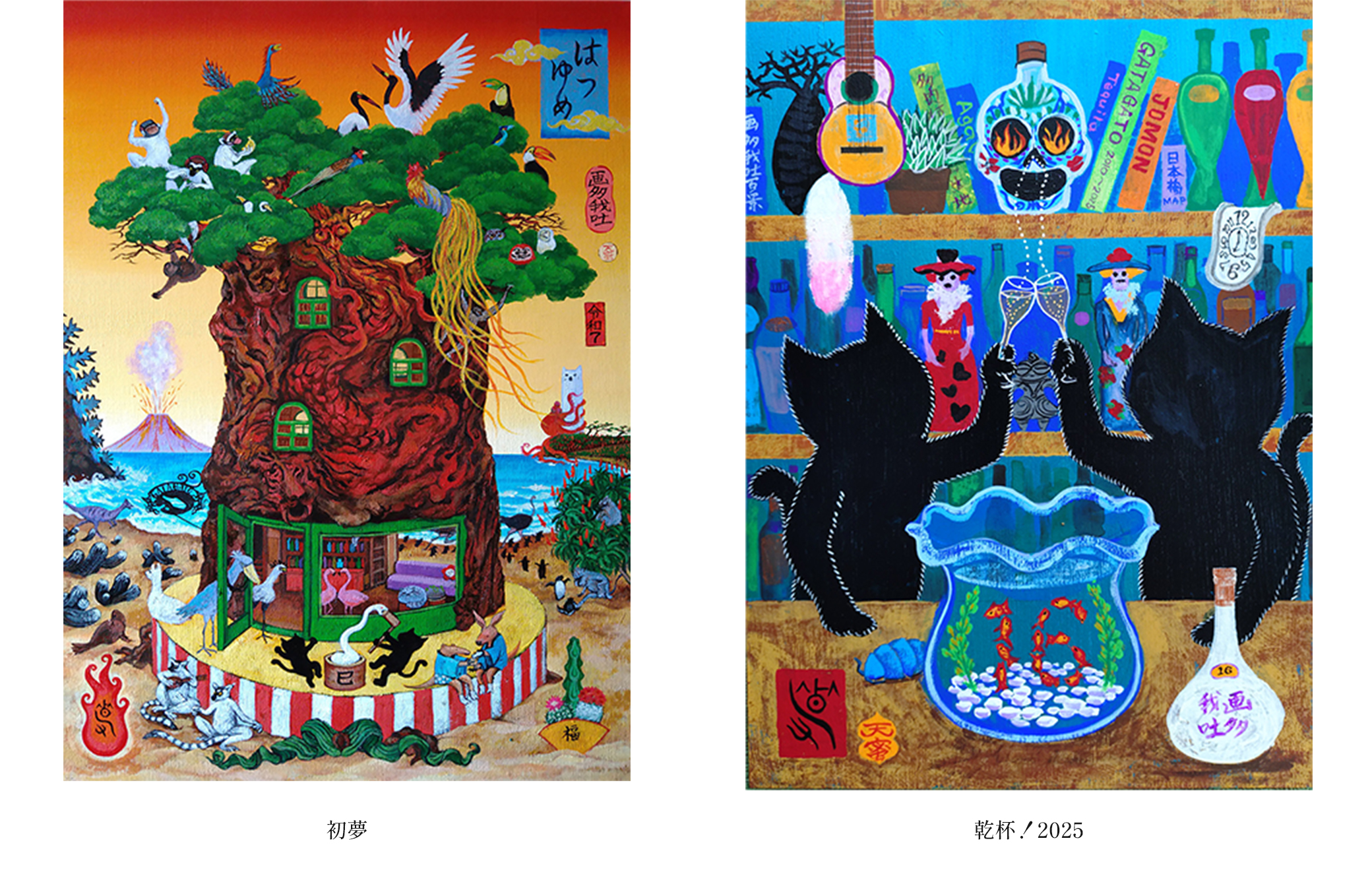 東京・日本橋の路地裏に、夜だけひっそりと明かりを灯す不思議なバーがある。その名は「GATAGATO」。 店のカウンターに立ち人々を迎えるのは、画家としてのもう一つの顔を持つ異色の経営者、佐野馨(さの かおる)だ。 彼女はキャンバスの上に幻想的な物語を描き出すと同時に、バーという空間そのものを一つの作品として育て続けている ─── 1975年に山梨県で生を受けた佐野氏は、多摩美術大学大学院で油画を専攻し画家としての道を歩み始めた。画家として着実にキャリアを積むと同時に、2010年には自身が経営するバー「GATAGATO」を東京・日本橋にオープン。店内には佐野氏自身が描いた絵画が飾られており、酒を片手に彼女が創造した世界に浸ることができる唯一無二の空間となっている。画家と鑑賞者が直接出会い、語り合うことができる。そんな ”生きたギャラリー” こそが、GATAGOTOなのだ。 佐野氏の代表的な作品は、2匹の黒猫「GATA」と「GATO」が登場する「GATAGATO」シリーズ。このシリーズでは、バー「GATAGATO」そのものが意志を持ったかのように、深海から宇宙まで時空を超えて旅をする。物語性豊かなこの作風は、観る者をノスタルジックでどこか切ない空想の世界へと誘い、まるで一枚一枚の絵画が”旅の記憶を切り取った絵葉書”であるかのようにも思わせる。 画家としてアトリエでキャンバスに向かう孤独な時間と、バーの経営者としてカウンターに立ち、人々と賑やかに交わる時間。この両極を往来することが、佐野氏の創作の源泉となっていると言う。バーでの出会いや会話が新たなインスピレーションとなり、それがまたキャンバスの上の物語を豊かにする。「GATAGATO」という空間は、彼女にとって作品を発表する場であると同時に、次なる作品を生み出すための土壌でもある。画家が営む ”旅するバー” の物語。日本橋の路地裏に灯るその小さな光は、これからも訪れる人々の心に、温かな物語を届け続けることだろう。 ▼展覧会予定 2025.12.13(土)~21(日) 月曜~金曜:15:00open / 18:00以降は通常のBar営業のため1,000円のチャージが発生 土日:11:00~19:00(Bar営業なし。入場無料) 会場:GATA GATO(ガタガト) 住所:東京都中央区日本橋堀留町1-2-9 ※新作展示の他、ポスター、ポストカード、カレンダーの販売、仙台のパン屋「まいにちのパン日々」のシュトーレン販売もあり。
