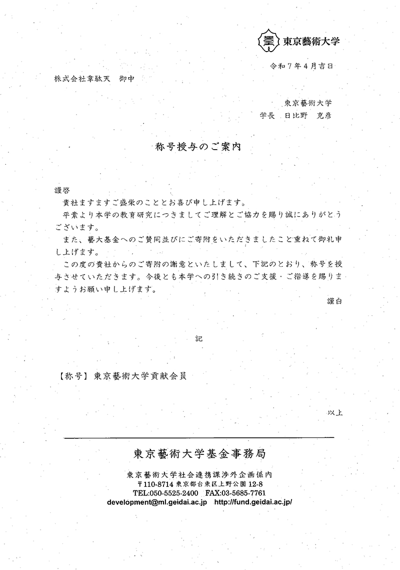 東京藝術大学からの称号授与のお知らせ 掲載日:2025.04.14 このたび、東京藝術大学様より、「東京藝術大学貢献会員」の称号を授与されました。 今後も、日本の美術界の発展のために微力ながら貢献してまいります。
