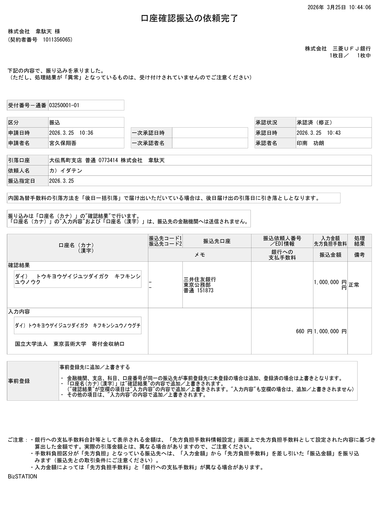 東京藝術大学 修学支援事業基金 寄付のお知らせ 掲載日:2026.03.25 様々な経済的理由により修学に困難がある学生等を対象として行われる「東京藝術大学 修学支援事業基金」に1,000,000円を寄付いたしました。未来の芸術を担う能力の高い学生の一助となれば幸いです。