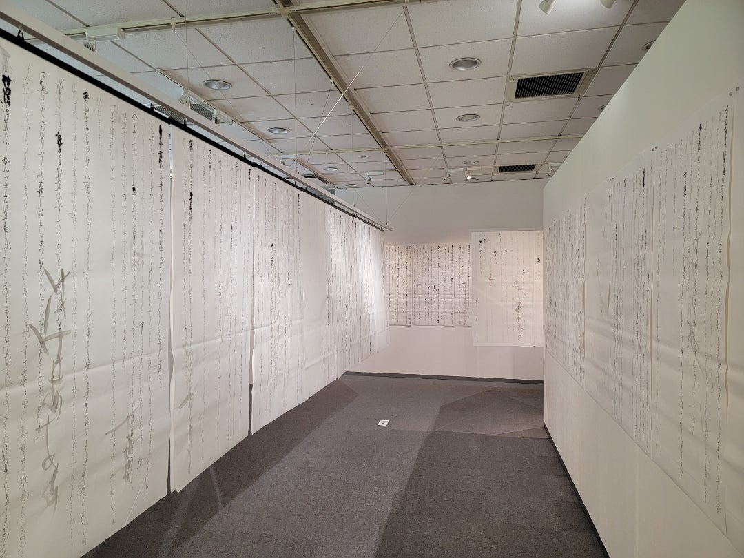 筒井康隆『残像に口紅を』の全文を書にした「今子青佳書道展 筒井康隆『残像に口紅を』」です。コロナ禍の直前に企画が決まり、外出のできない時期に5年かけて制作しました。全紙サイズの紙200枚ほどにびっしり文字を書き連ねる行為は、筒井さんの文体を自分の中に取り込む作業のようでもあり、写経のようでもありましたが、同時に自分の文字として作品ができていくのは不思議な感覚でした。会期中に、著者の筒井康隆さんご自身にも見に来ていただけたのは嬉しい出来事でした。