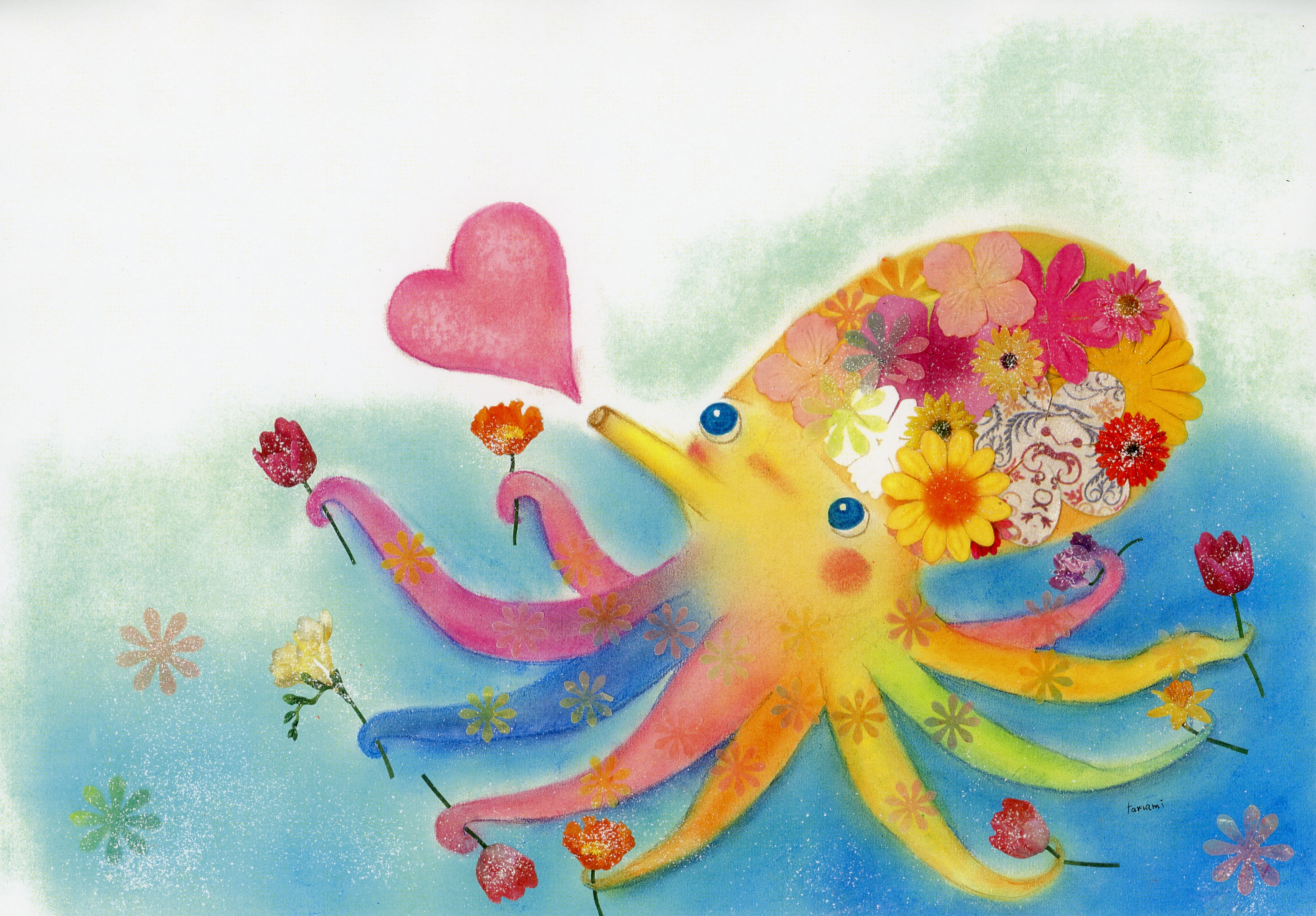 故郷の福島市の百貨店で個展を開いた時のことです。ある女性が、初日に来てくれて、「ハナサキタコ」という作品をずっと観ていました。その時は何も喋らずに帰られたのですが、後日会期中に数回来てくれて、最終日にはお父さん、許してくださいと手を合わせて、その絵をお買い求めいただきました。話を伺うと、その方は震災で実家と両親を失い、当時、仮設住宅で過ごしていた方で、暗い玄関に飾る絵を探していたのです。海をイメージする絵は震災を思い出してしまうと躊躇していたけれど、この絵は玄関を明るくしてくれる、今は辛い思い出しかないけれど、自分の故郷を嫌いになりたくない、このタコは、毒や墨ではなく、ハートを吐くようで、故郷を好きでいさせてくれる気がすると、お父様が残してくださったお金で私の絵を選んでくださいました。この出来事はとても印象に残っています。