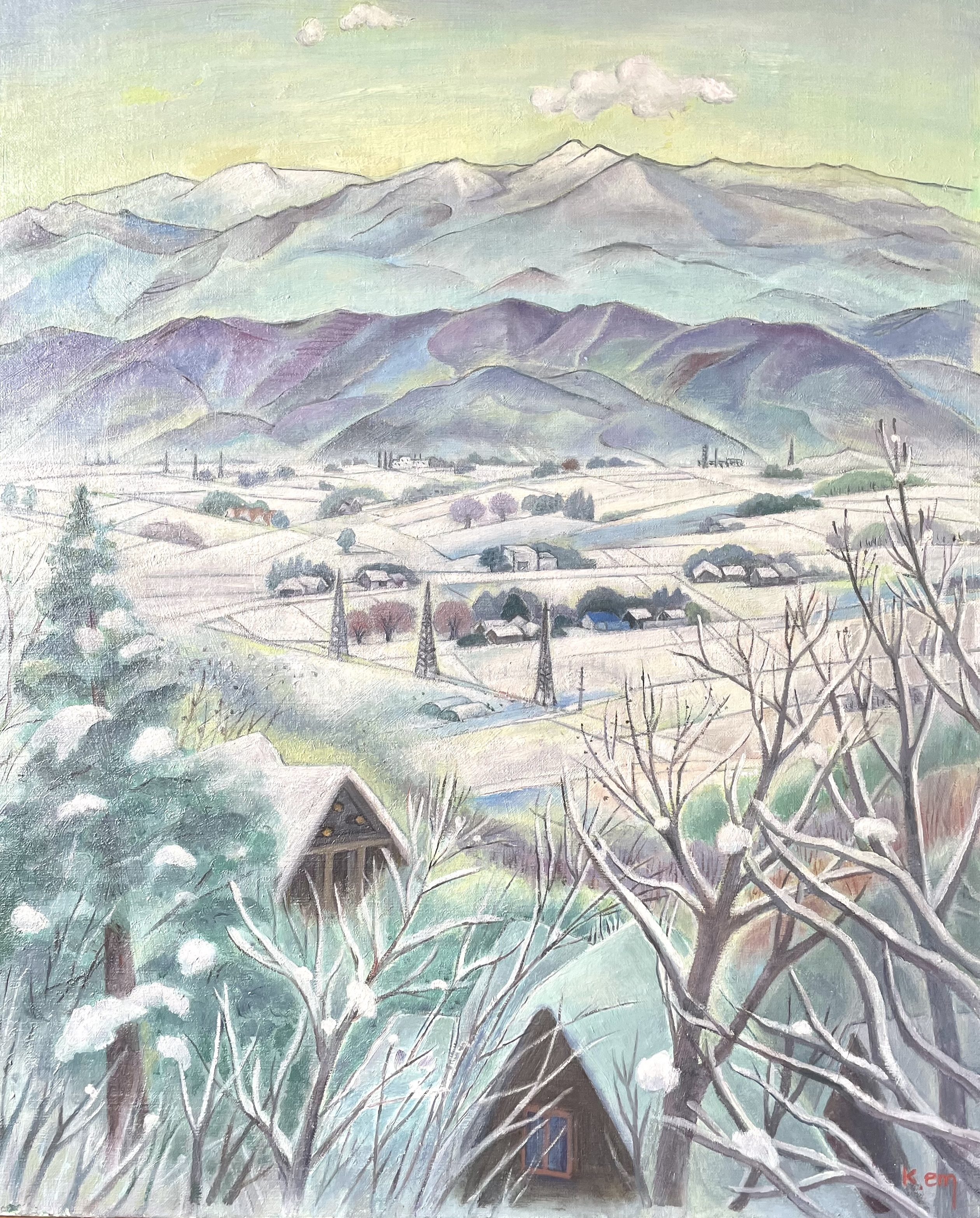 『安曇野絵画コンテスト』は何度か訪れた安曇野で目にした道祖神、国定公園、桜や水車小屋を赤を施した画面に配置し、幻想的に描きました。タイトルには母が安曇野に寄せて詠んだ道祖神の短歌を用い、記念の絵となりました。