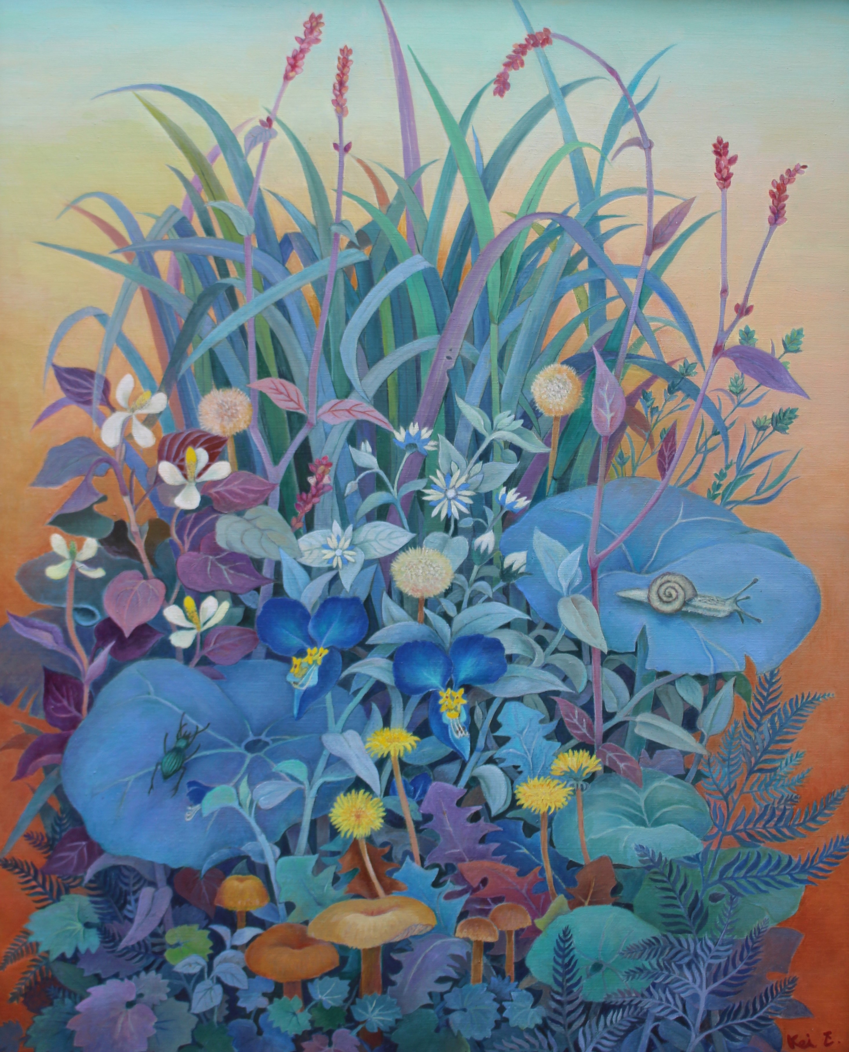 描いた作品の中で私らしいと思える絵は、F30「野草の詩(やそうのうた)」です。若い頃、公募展で優秀賞を獲得した思い出深い作品で、野の花や虫たちは小さくも必死で生きている、その存在感を絵に表現したいという思いで描きました。10代の頃から親しんだアンリ・ルソーの影響も強く、彼の神秘的で幻想的な世界観が今も私の中に息づいています。