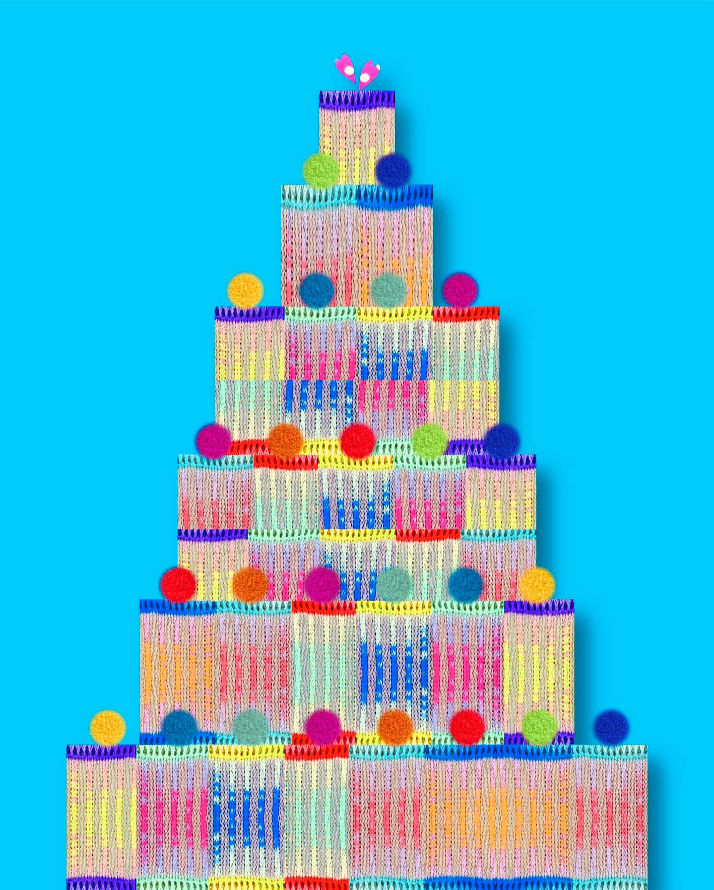 でも社会人になってから絵を描くことをしていなかったので、最初は頭の中で想像していることを形にするのがとても難しかったです。例えば『ケーキ』という作品は、おばあちゃんが着ていたようなかすり糸を使ったカーディガンの編地から取っています。このようなデザインを着る人が年々減ってきて、需要がなくなってきたのを数字で目の当たりにした時にこのままではダメだ、編地だけ見ればすごくかわいいのに服にすると需要がなくなる、どうしたらこの可愛い編地を生かせるだろうという思いから作り始めました。思い付きで始めたものの、想像しているものと出来上がったものとの差がありすぎて、途中何度もあきらめかけ暗中模索の日々が続きすぐに今の表現にたどり着いたわけではありませんでした。活動を始めて1年半経ちましたが、今はコンスタントに作品を作り続ける難しさも感じております。