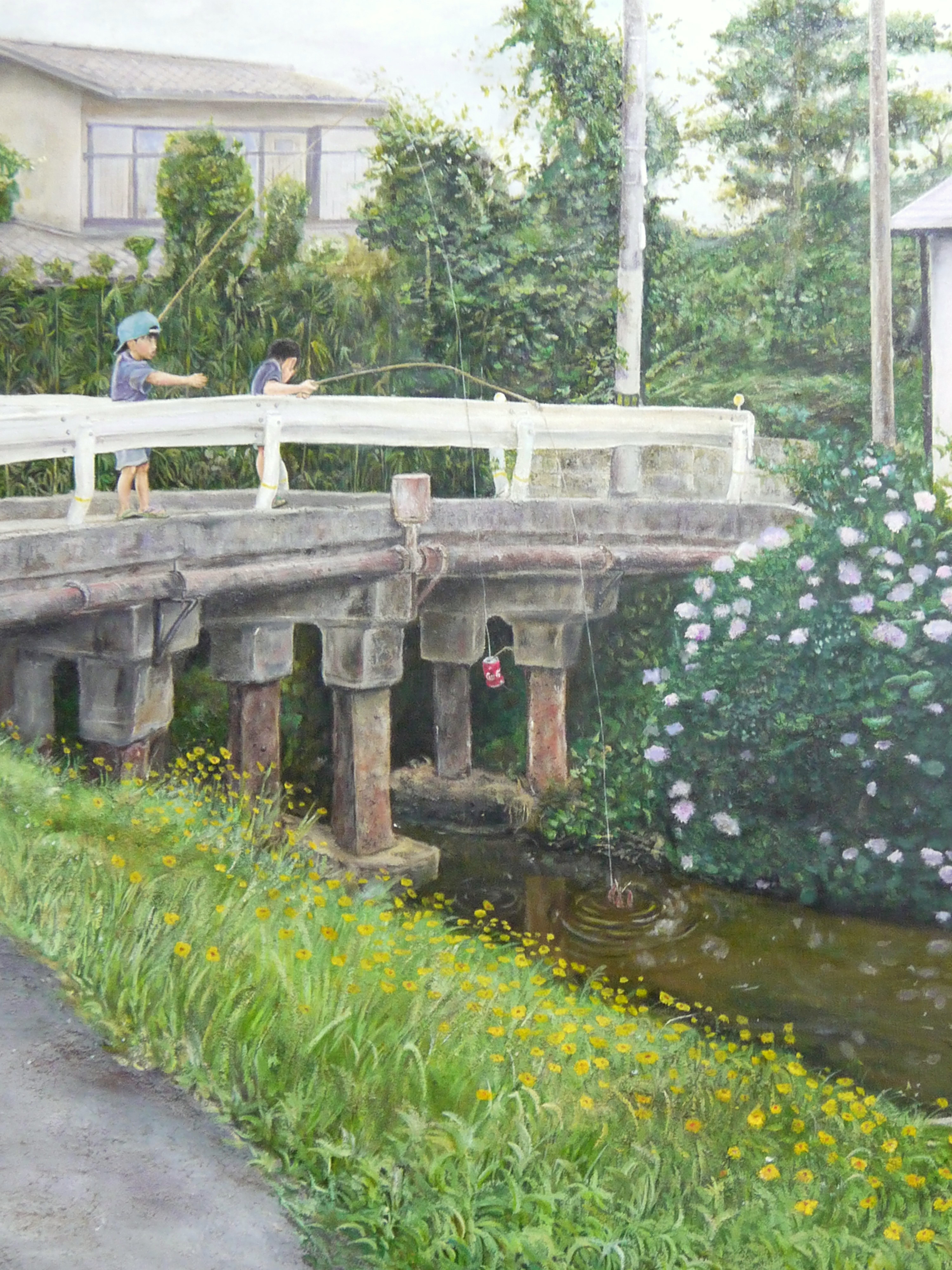 特に思い入れのある作品は「ざりがに釣り」です。油絵の2作品目で、現在は成人している甥二人がザリガニ釣りをしている風景です。あまり興味がなさそうな弟がザリガニを釣って、一生懸命な兄は空き缶を釣るという面白い物語があります。
