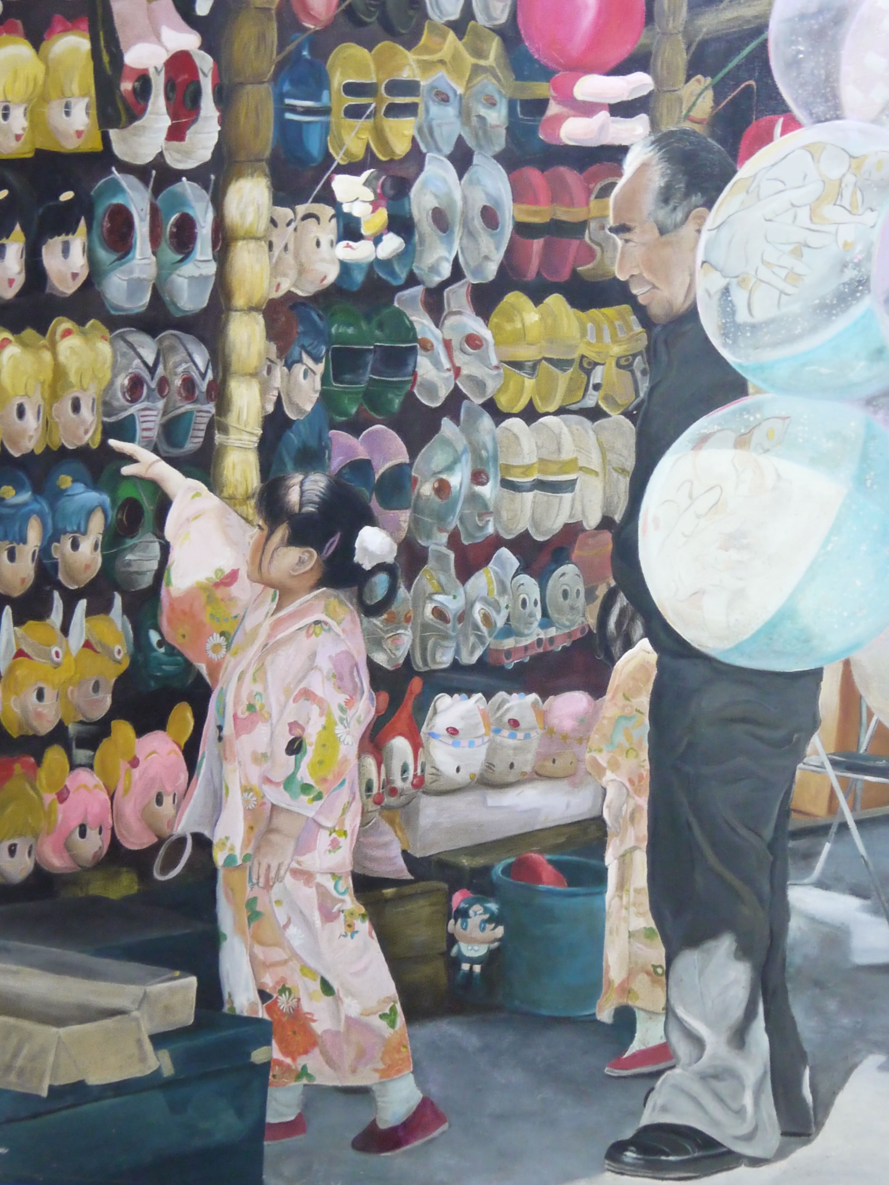 また、「初詣の帰りに」も気に入っています。おじいさんが正月に帰郷した可愛い孫娘たちに出店のお面を買ってあげている風景ですが、この作品にも物語があって、姉妹は着物を着ているのですが、靴を履いています。溌剌とした元気な女の子だから、着物を用意したおばあさんが靴を用意したのかなと想像できていいなと思いました。この作品を展覧会に出展したのですが、親子が肩車をしながら楽しげに鑑賞していて。その姿を見て、描いてよかったなと心から思いました。