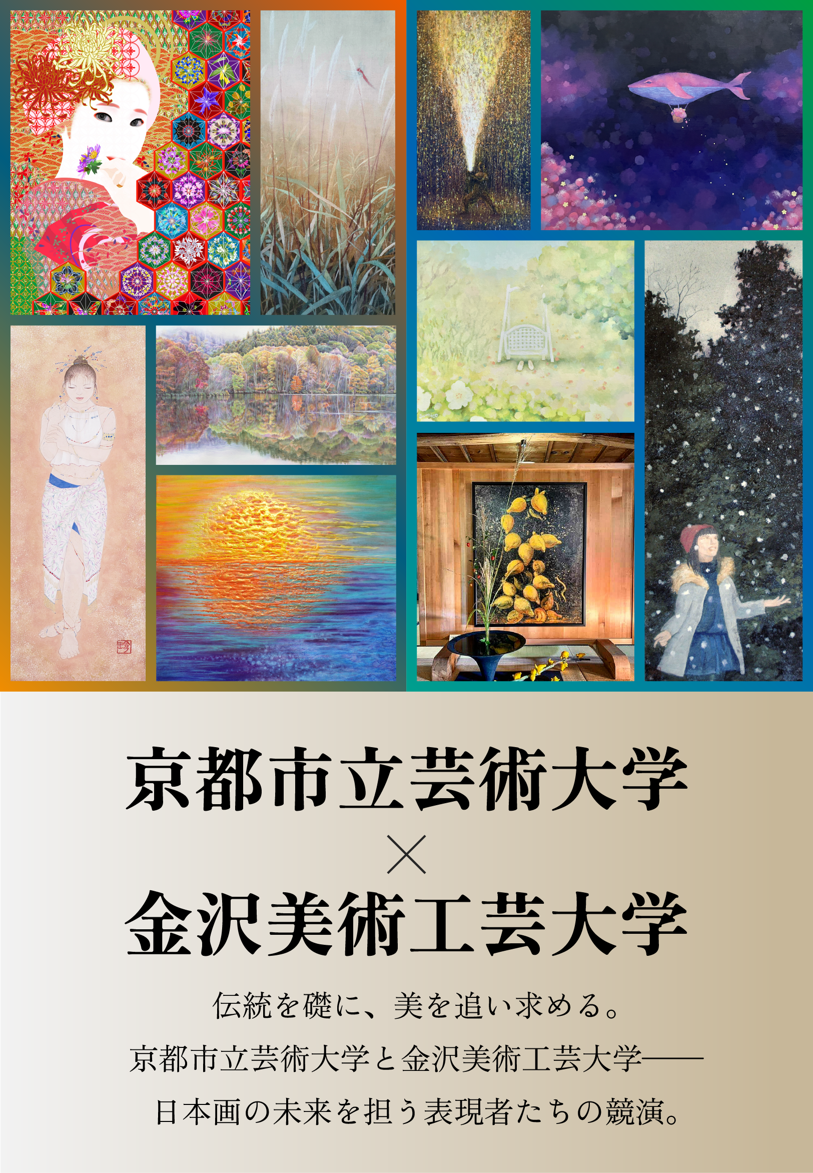 京都市立芸術大学と金沢美術工芸大学は、それぞれ千年の都・京都と加賀百万石の文化が息づく金沢という、日本の伝統文化・工芸の中心地で歴史を重ねてきた公立の芸術大学です。両大学が共通して重視するのは、脈々と受け継がれてきた「技」と「素材」に対する深い理解。特に、日本独自の美意識が凝縮された”日本画”の分野においては、長年の伝統に裏打ちされた高度な専門教育で知られ、独自の表現を切り拓く力を持った数多くの作家を輩出してきました。 本特集では、古都の系譜に連なる美の探求者、京都市立芸術大学と金沢美術工芸大学に焦点を当てます。伝統と現代、技術と感性が高いレベルで融合した、両大学の在学生・卒業生による力強くも繊細な作品群をご覧ください。
