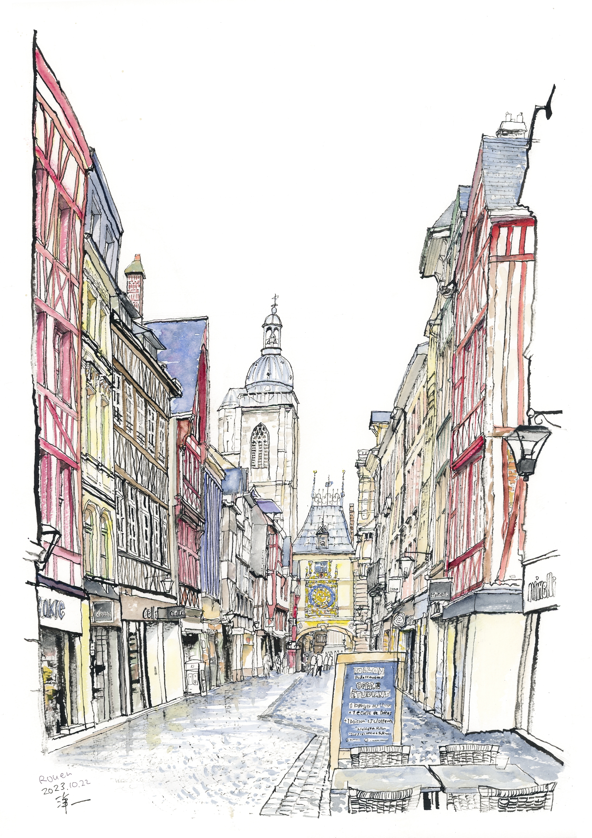ピースボート寄港地の風景スケッチシリーズ-フランス・ルーアンの大時計通り