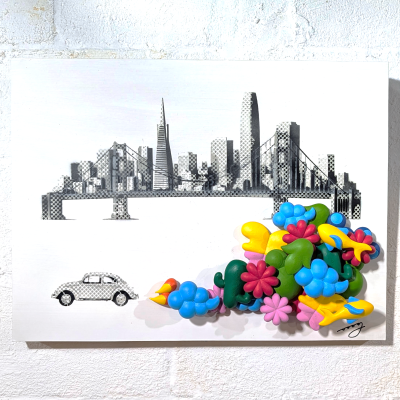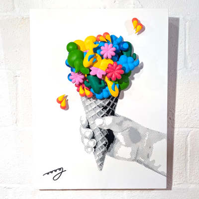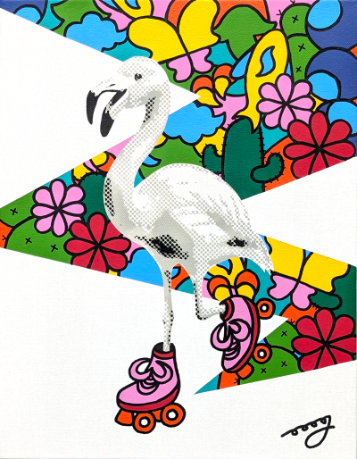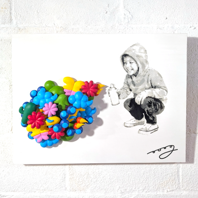 作品の中でMoyは、喜びと緊張、遊び心と影といった、人間の感情が持つ二面性をテーマに、アクリル絵具やスプレーによる鮮烈な色彩と、ステンシルによる強いコントラストを重ね合わせています。