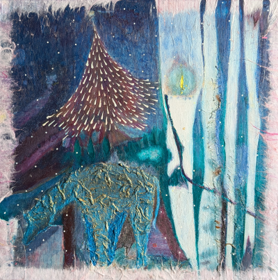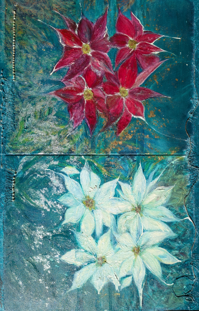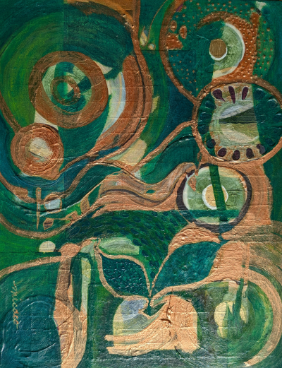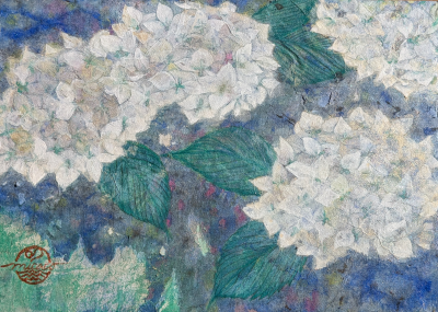 紙を大切にしたい思いから、和紙や半紙、古い洋書などに好きな色を重ねて創ったコラージュ素材を使って抽象画を描いています。