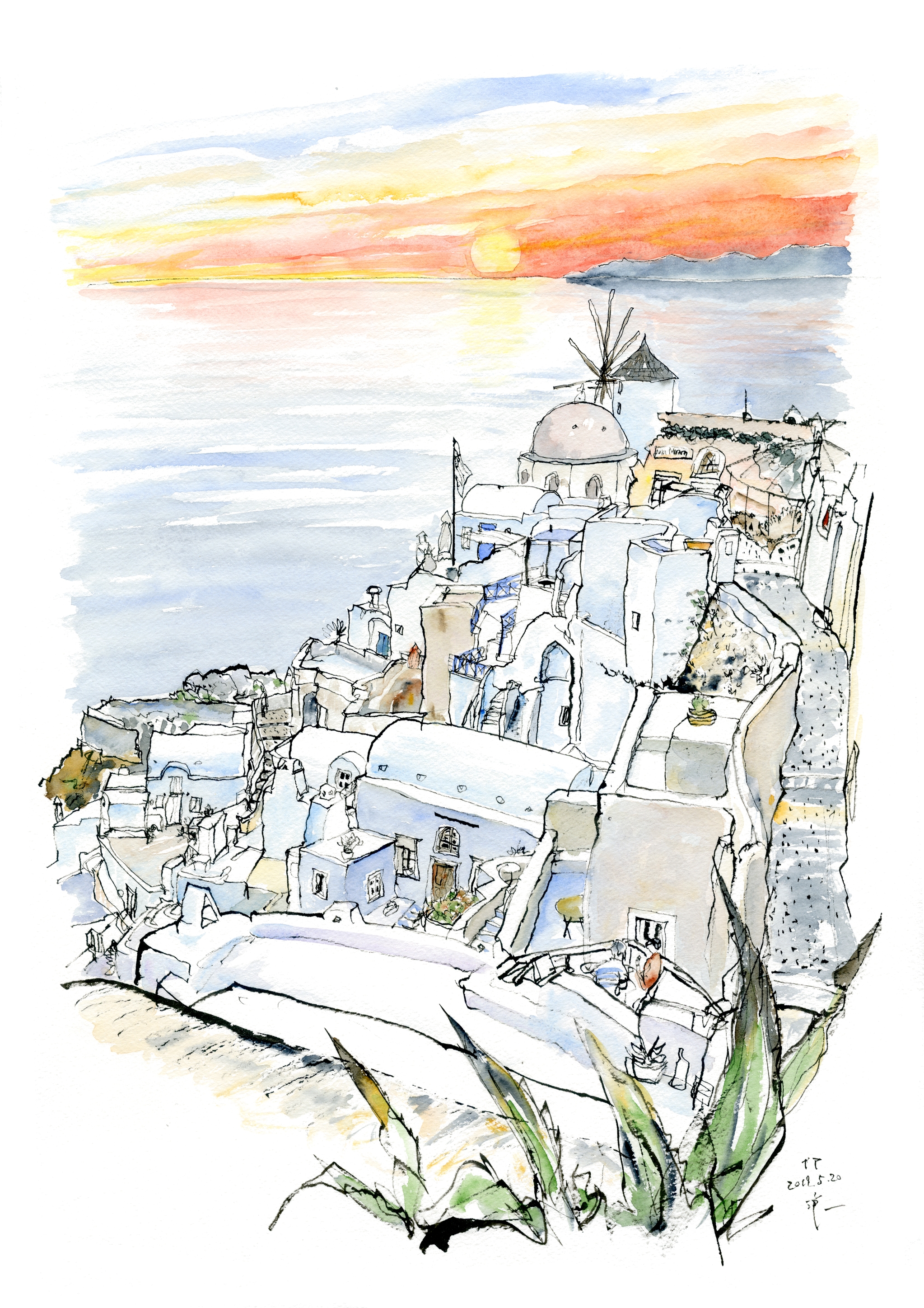 「ピースボート寄港地の風景スケッチシリーズ-サントリーニ島の夕日」
