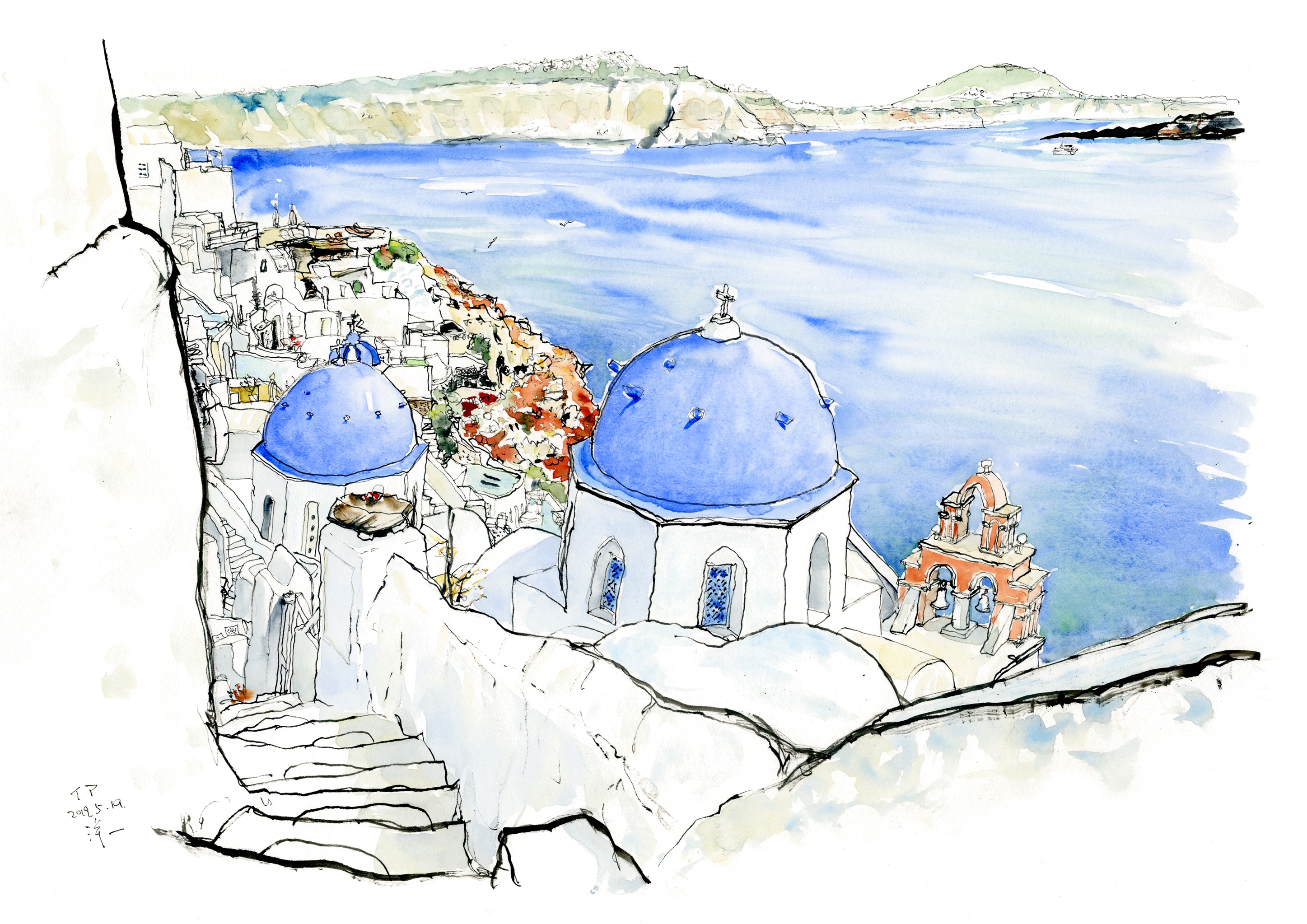 「ピースボート寄港地の風景スケッチシリーズ-サントリーニ島の青い屋根の教会」