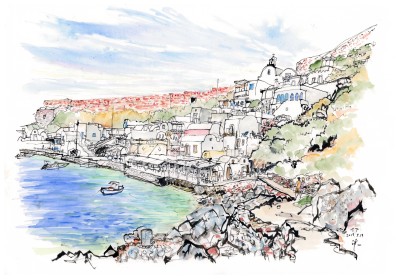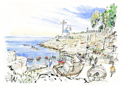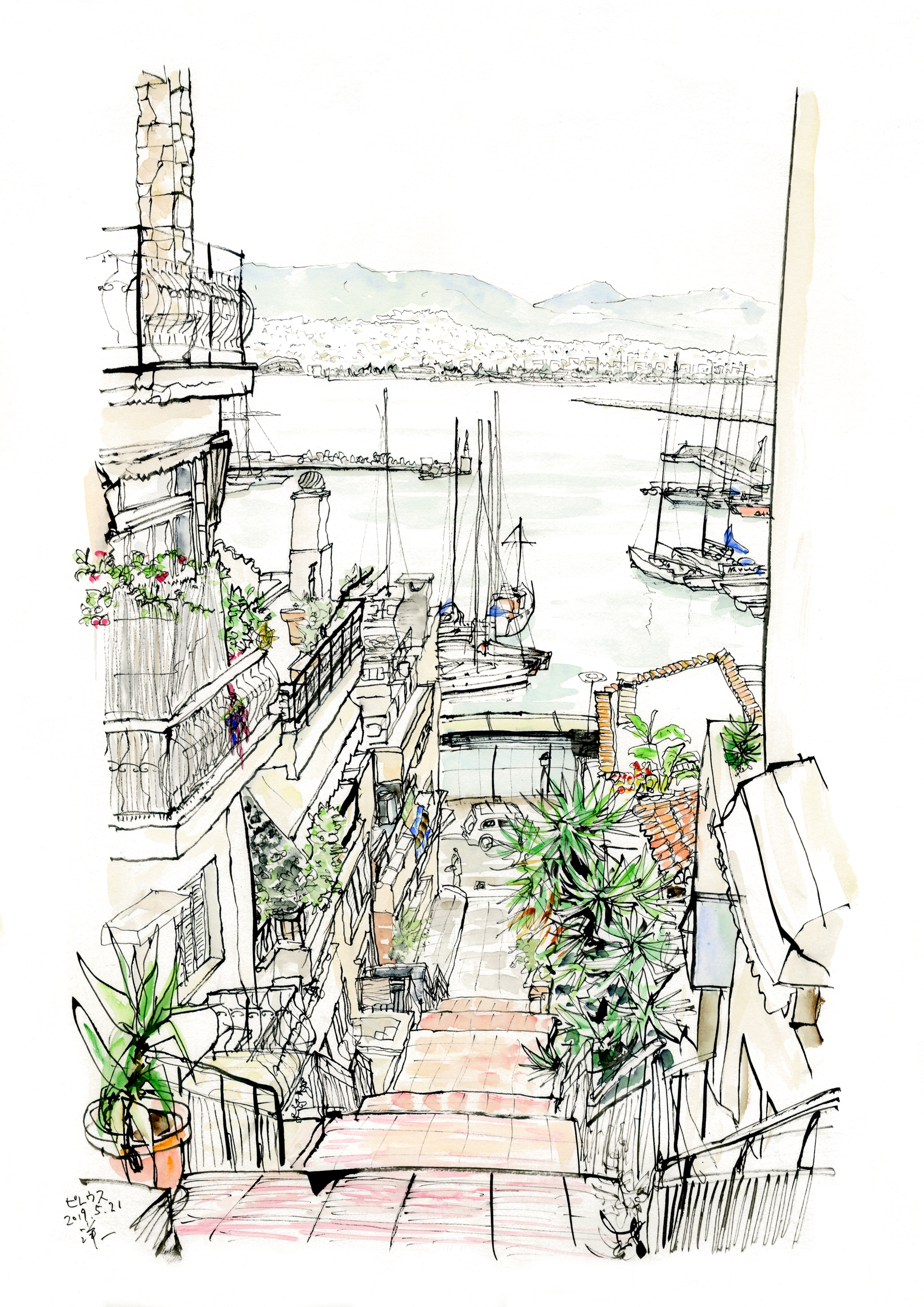 「ピースボート寄港地の風景スケッチシリーズ-ギリシャ、ピレウスの小さな入り江」