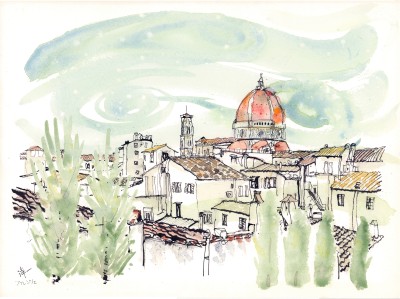 「ピースボート寄港地の風景スケッチシリーズ-ギリシャ、ピレウス,アギアトリアダ大聖堂が見える庭園」