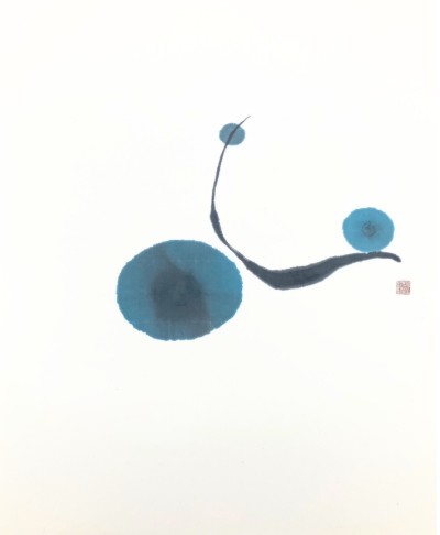 本展では「本来のわたしへ還る旅」というテーマのもと、内なる宇宙から届くインスピレーションを墨で表現しています。作品づくりでは、墨の濃淡や余白にこだわり、それぞれの線や形に心の在り方を映し出しました。墨は私にとって感情の言葉であり、自分自身と向き合うための手掛かりであると考えています。