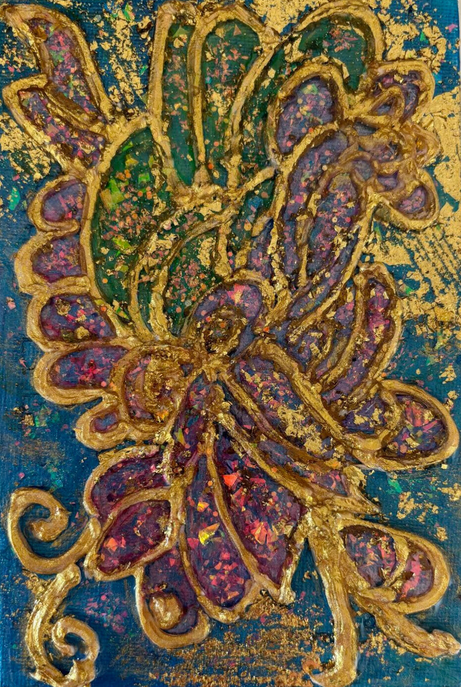 金色を使うようになったのは、波動が高い色だと聞いたことがきっかけで、試しに使ってみたところ、不思議としっくりきました。私は、自身の作品の中で光の波動を描いている感覚があります。光とはエネルギーそのものであり、豊かさや自信を象徴するすると言われている金色だからこそ表現できるものがあると感じています。作品を通して、見る人にポジティブなエネルギーを届けたい。そうした思いから、金色には特別なこだわりを持って制作しています。