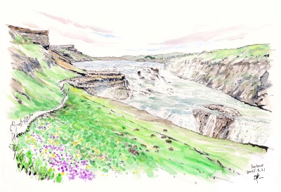 ピースボート寄港地の風景スケッチシリーズ-アイスランド、グルフォスの滝